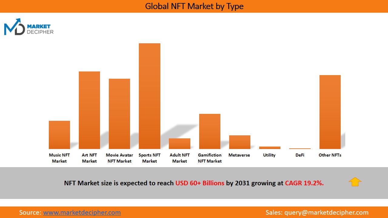 NFT Market is segmented based on sales type (primary and secondary market), product type (Collectible Images, Collectible Videos, Collectible Audio, Others), NFT Market by Sector (Music NFT, Art NFT, Movie Avatar NFT, Sports NFT, Adult NFT, Gamification NFT, Metaverse, Utility, DeFi, Others).